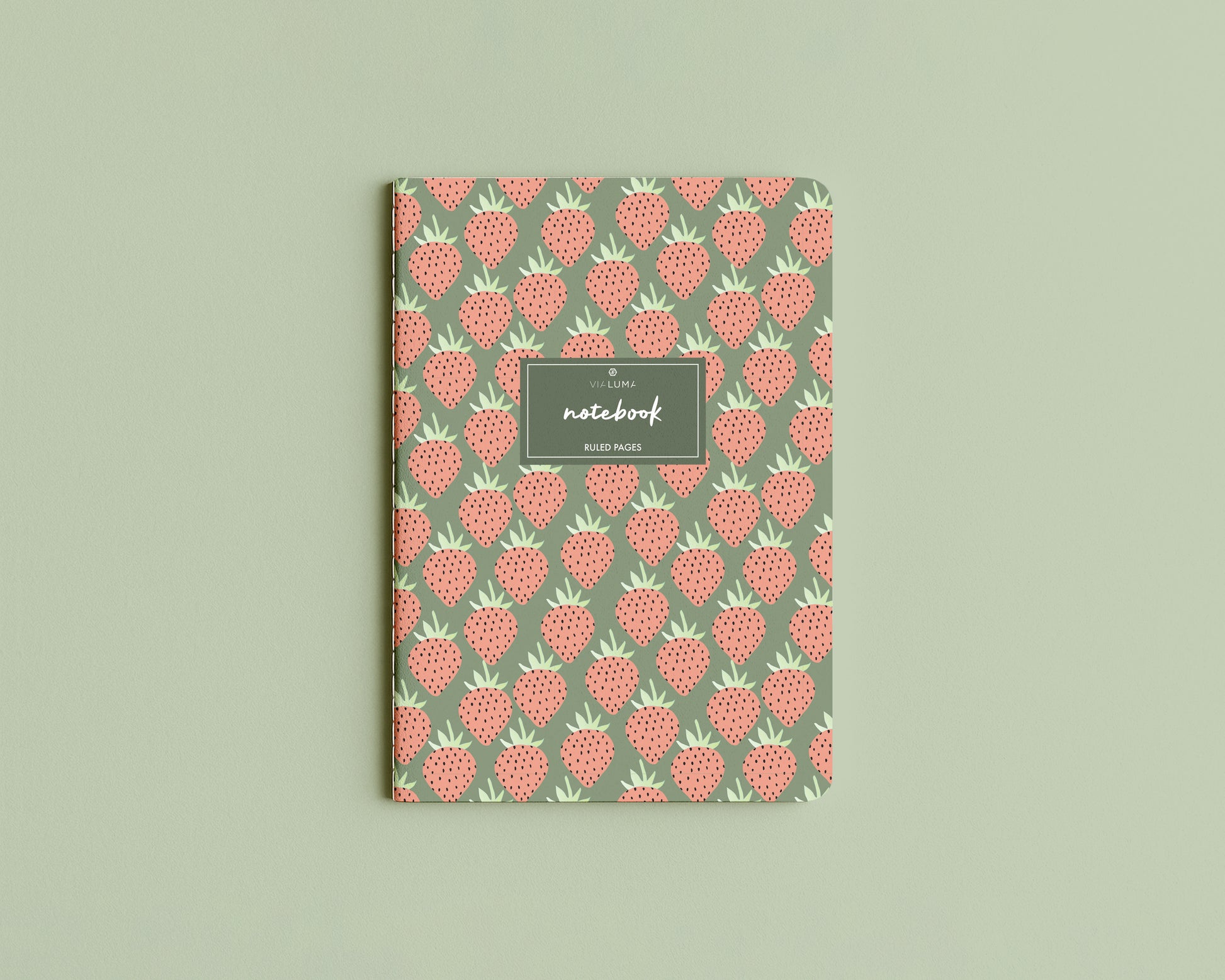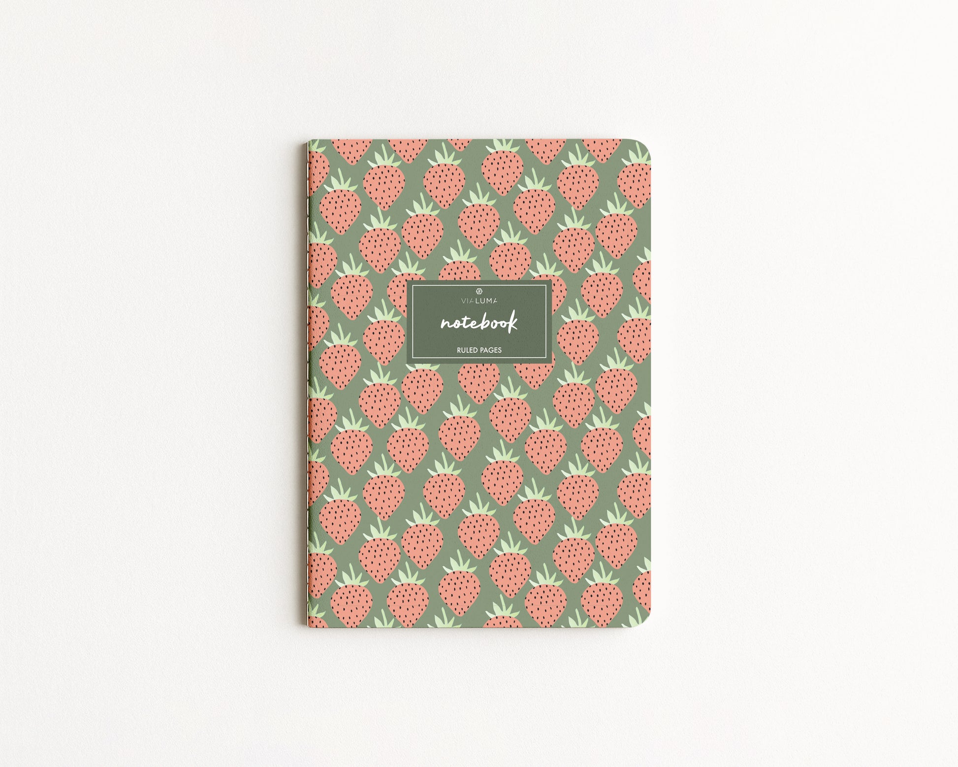 A lightweight, softcover notebook featuring stitched binding, 100 ruled pages, and colorful strawberry print - perfect for work, school, and daily to-do's.