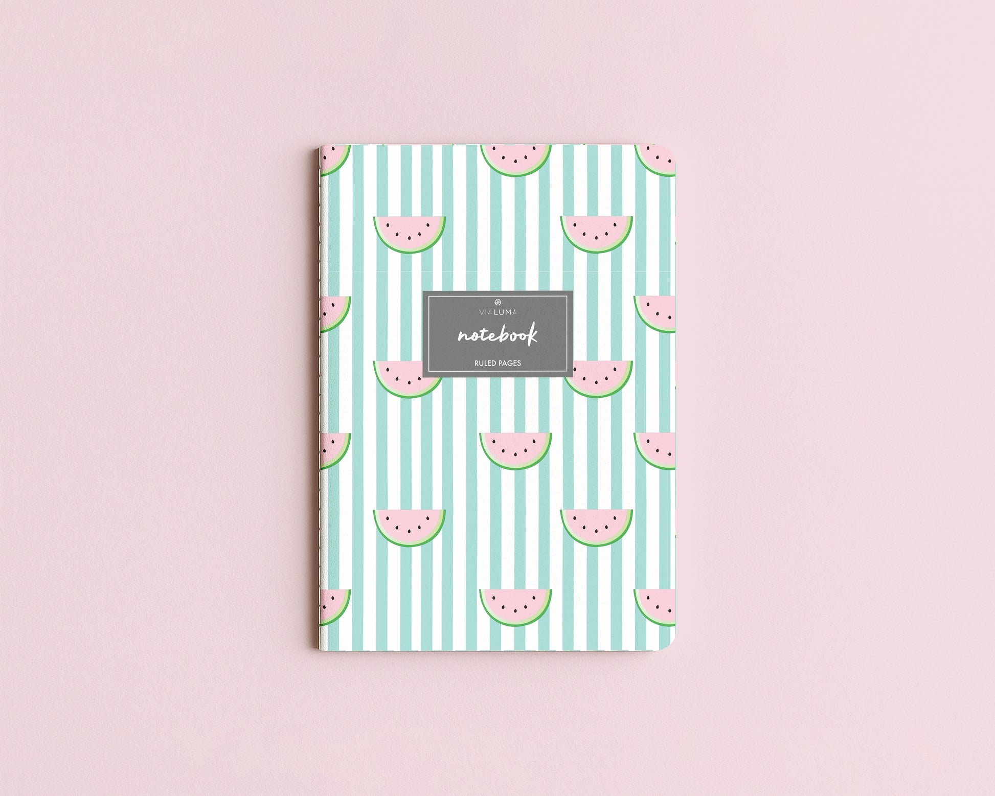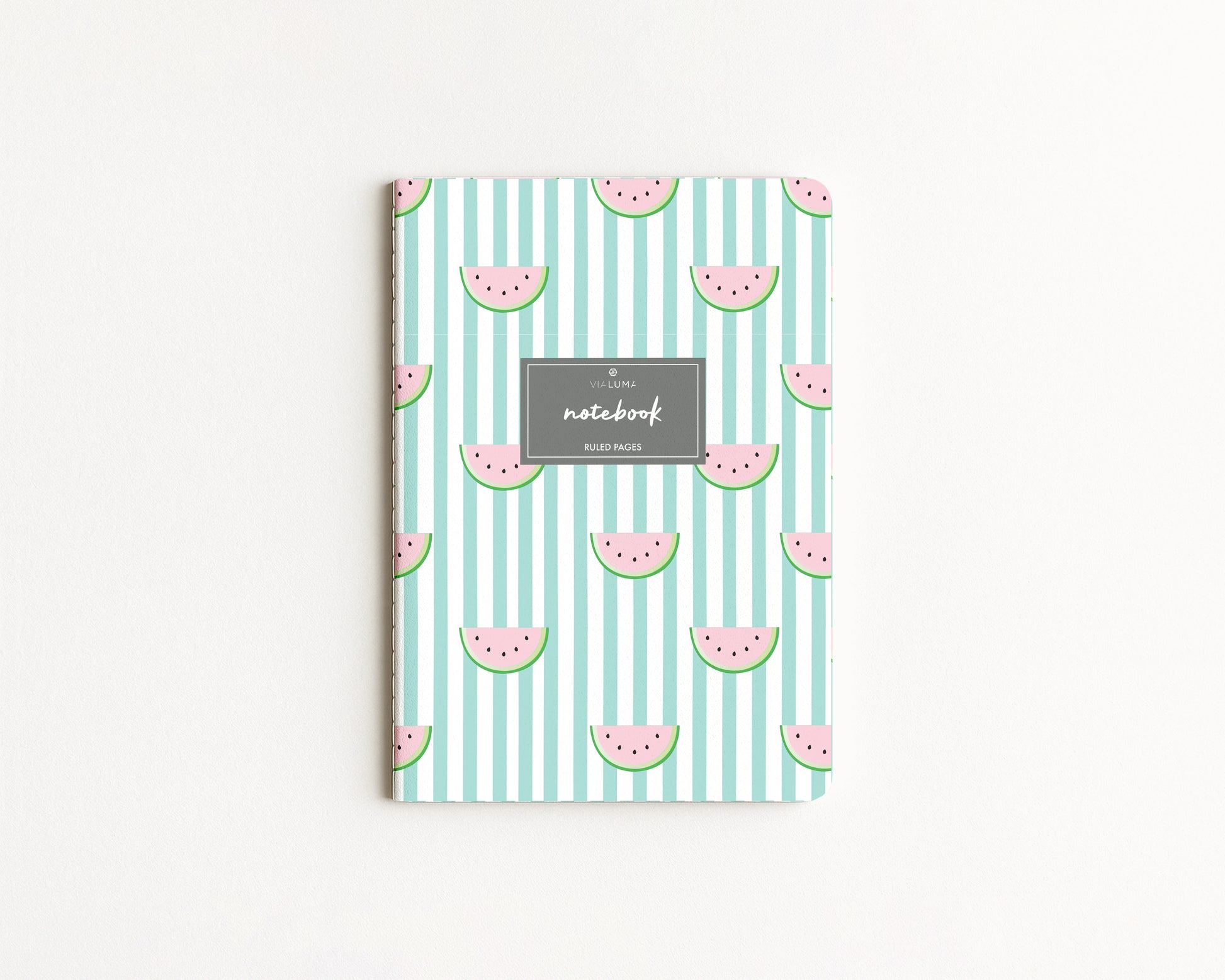 A lightweight, softcover notebook featuring stitched binding, 100 ruled pages, and colorful watermelon print - perfect for work, school, and daily to-do's.